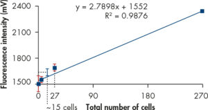 Efficient detection of viable cells. Error bars are shown in red. The blue error bar represents the extrapolated data of detectable cells. The total volume was 300 μl and a total of 27 cells in 300 μl were measured. A total of 15 cells in 300 μl can be detected (extrapolated).